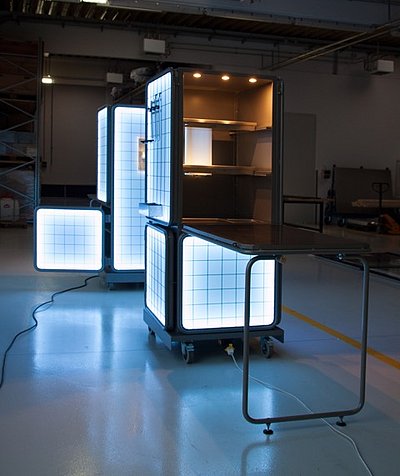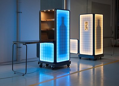 20 Absolut Vodka-Flaschen, 60 Gläser und 10 Flaschen für Beigetränke sowie eine Kühlmöglichkeit für Eiswürfel und Früchte, reichlich Stauraum für Bar-Utensilien, ein Abfallbehälter und eine Arbeitsfläche: Die mobile Bar, die Industrial Design-Student Stefan Pichler im Rahmen des Absolut-Design-Wettbewerbs entworfen hat, ist klar und einfach in seiner Form, gleichzeitig extrem wandelbar und höchst funktional, sehr geräumig und zudem einfach zu transportieren. Dank der arretierbaren Rollen kann die Ausschank leicht bewegt und auf einen Lastwagen verladen werden. Ein Gitter-Container ist die Basis der robusten und gleichzeitig leichtgewichtigen Pop-up-Bar mit den Maßen 70x80x180 Zentimeter. Der Behälter ist im Inneren mit einer lichtdurchlässigen Leichtbauplatte ausgekleidet. Durch flexibel am Gitter einhängbare Behälter lässt sich der Stauraum problemlos erweitern. Die variierbare LED-Beleuchtung setzt gewünschte Lichtakzente. An der Vorderseite der Box befinden sich beleuchtete Nischen, die der Präsentation von Flaschen dienen.