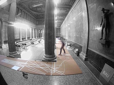 Für die TeilnehmerInnen des Projektstudium-Workshops (Schwerpunkt konzeptionelle Designstrategien) bei Gastprofessor Christian Fröhlich ergibt sich dabei die einmalige Möglichkeit zur Kooperation mit dem Institut für bildende Kunst (Performative Art | Carola Dertnig) zur Bespielung des prominentesten Raumes der Akademie – der Aula. Die Live Performances “Staging Archive ! Staging History !” in Zusammenarbeit mit Andrea Salzmann/Anat Stainberg werden von Studierenden der Abteilung für raum&designstrategien der Kunstuniversität Linz mit einer dialektischen Installation konfrontiert, die jene Flächen der Aula bespielen, die von den Performances unberührt bleiben. Es handelt sich dabei nicht um die “Back-Stage”, sondern eher um die “Anti-Stage”, die Restfläche hinter den Säulenreihen, die interessanterweise ein umlaufendes Kontinuum bildet, das es uns erlaubt einen Rundgang im Rundgang zu installieren, der die BesucherInnen zum Begehen und Verweilen einladen wird.