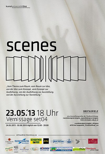 Scenes ist eine Installation von set 04, die im Zuge der Ausstellungsserie BROT&SPIELE der Studienrichtung raum&designstrategien an der Kunstuniversität Linz entsteht. Die StrategInnen Nizar Aguir, Marion Baumann, Florian Hummer, Rhea Schatowitz und Veronika Schwaninger beschäftigen sich dabei mit dem veränderbaren Theaterraum und seinen Spielarten.
