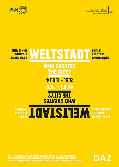 Zur Eröffnung der WELTSTADT Ausstellung am 2.5.2014 um 18 Uhr sprechen Heiner Farwick, Präsident des Bundes Deutscher Architekten BDA, Johannes Ebert, Generalsekretär des Goethe-Instituts, Gunther Adler, Staatssekretär im Bundesministeriums für Umwelt, Naturschutz, Bau und Reaktorsicherheit und die beiden Kuratoren des Projekts, Angelika Fitz und Matthias Böttger.
