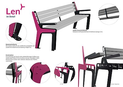 Der Entwurf für die Sitzgelegenheit „Len_Sitz(s)kul(p)tur“ der Erstplatzierten Nicole Hübscher (Studentin Industrial Design) konnte die Jury durch einen durchdachten, nachvollziehbar alterstauglichen Aufbau des überzeugen, der zudem durch hohe Funktionalität und Umsetzbarkeit besticht. Besonders beeindruckt war Jury außerdem von der hohen Qualität der theoretischen Recherche und Aufbereitung. Zudem wurde auch der Linz-Bezug des Designs, die Konfigurierbarkeit und die Verwendung von recycelbarem Kunststoff sehr positiv bewertet. Alles in Allem stellt die Einreichung von Frau Hübscher jenes Gesamtpaket dar, das die Kriterien der Ausschreibung in höchstem Maße erfüllt.