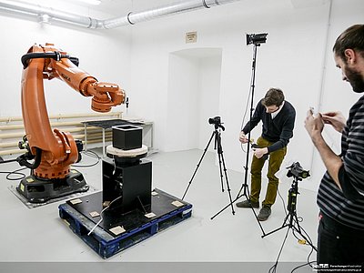 Chris Noelle ist Multimediakünstler und befasst sich insbesonders mit Projectionmapping, Interaktionsdesign und Lightpainting. Der Lehrstuhl für Individualized Production in Architecture der RWTH erforscht neue Roboteranwendungen im Bereich der Architektur und Bauindustrie.