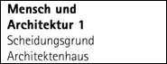 Die Ausstellung Mensch und Architektur 1: Scheidungsgrund Architektenhaus vereint Arbeiten, die sich mit dem Verhältnis Mensch/Architektur auseinandersetzen. Von besonderem Interesse sind dabei die Spannungen und Verwerfungen, die durch dieses Verhältnis auftreten. Untersucht werden sowohl Bereiche wie Unbehagen, Unheimlichkeit und Kontrolle als auch formale Fragen nach Raum und Leben. Wie weit wirkt sich das private Verlangen nach ästhetischen Formen aus und wie bestimmt und kontrolliert uns öffentliches Bauen.