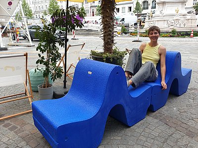"dwello`Wellenreiten` in der city" von Anna Weberberger schafft Platz zum Sitzen, Liegen und „Wellenreiten“ im öffentlichen Raum der Stadt Linz.