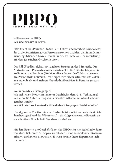 PBPO steht für „Personnel Bodily Parts Office“ und formt ein Büro welches durch die Autorisierung von Personalausweisen und dem damit im Zusam-menhang stehenden Prozess, Raum für eine kritische Auseinandersetzung mit dem juristischen Geschlecht bietet.