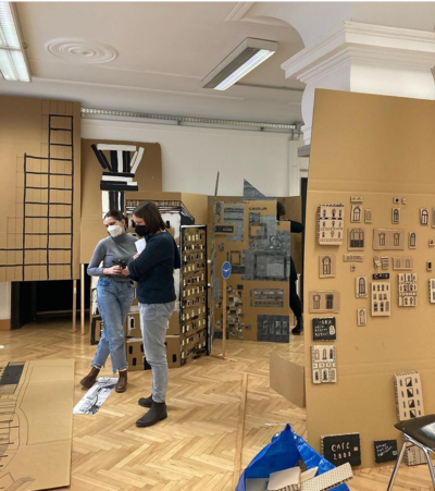 Zum Abschluss des Wintersemesters wird in der ehemaligen Strafsachengalerie eine Versuchsstadt aus Wellkarton gebaut. Studierende bauen „ihr“ Haus als Kulisse für das What-If- Thema, das sie ein Semester lang erforscht haben. Zusammenmontiert ergeben die Kartonhäuser das Modell einer zukünftigen Agora, die im Sommersemester in den realen Raum der Stadt wandern wird.