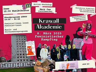 Die Lehrveranstaltung "Krawall Akademie" hat das Ziel, eine umfassende und kritische Auseinandersetzung mit dem Internationalen Frauen*Tag und dem 8. März als Symbol des feministischen Kampftages zu fördern. Durch die Integration intersektionaler Theorien und künstlerischer Praxis sollen die Studierenden ein tieferes Verständnis für komplexe feministische Protestformen und die dazugehörige Widerstandskultur entwickeln. Ein zentrales Anliegen ist es, den Studierenden die Möglichkeit zu geben, eigene künstlerische Arbeiten zu entwickeln, die sich mit dem Thema befassen. Diese können am 8. März 2025, dem feministischen Kampftag, an verschiedenen Orten in Linz, wie dem Ausstellungsraum splace am Hauptplatz, der Stadtwerkstatt oder im Rahmen der Demonstration, präsentiert werden. Es gibt auch die Möglichkeit, in einem dreitägigen Workshop unter der Leitung der lateinamerikanischen Künstlerin und Aktivistin Mary Cow eine gemeinsame Performance zu erarbeiten.