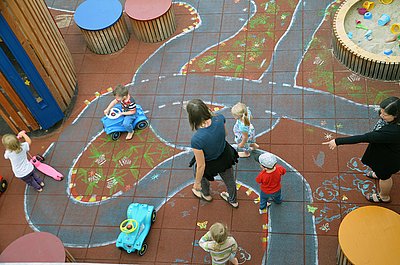Hoch in der Luft bietet der neue Belag ein Netz, in das man sich sicher fallen lassen kann. Trotz seiner Abgehobenheit von der Welt verliert er den Bezug zur Erde nicht und lässt Kinder trainieren, auf sicheren Beinen im Leben zu stehen.