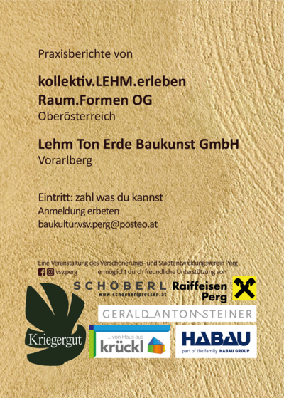 Der Lehmbauvortrag wird organisiert von Johanna Lindinger, Magdalena Breiteneder, Josseline Engeler und dem Stadtentwicklungs- und Verschönerungsverein Perg und bildet den Auftakt der Vortragsreihe BAUKULTUR.
