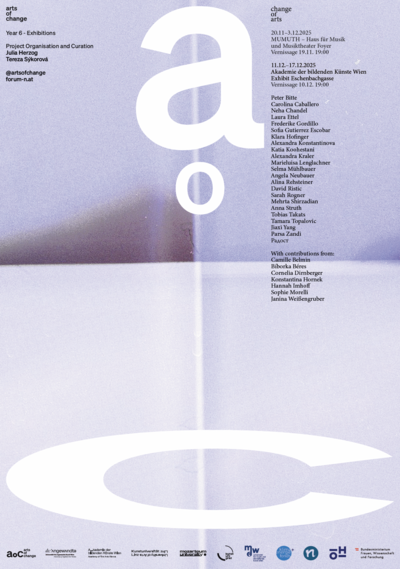 Arts of Change wird finanziert vom Bundesministerium für Frauen, Wissenschaft und Forschung, Klima- und Energiefonds, Österreichische Hochschüler:innenschaft, Universität für angewandte Kunst Wien, Akademie der bildenden Künste Wien, Universität für Musik und darstellende Kunst Wien, Kunstuniversität Graz, Kunstuniversität Linz und Universität Mozarteum Salzburg.